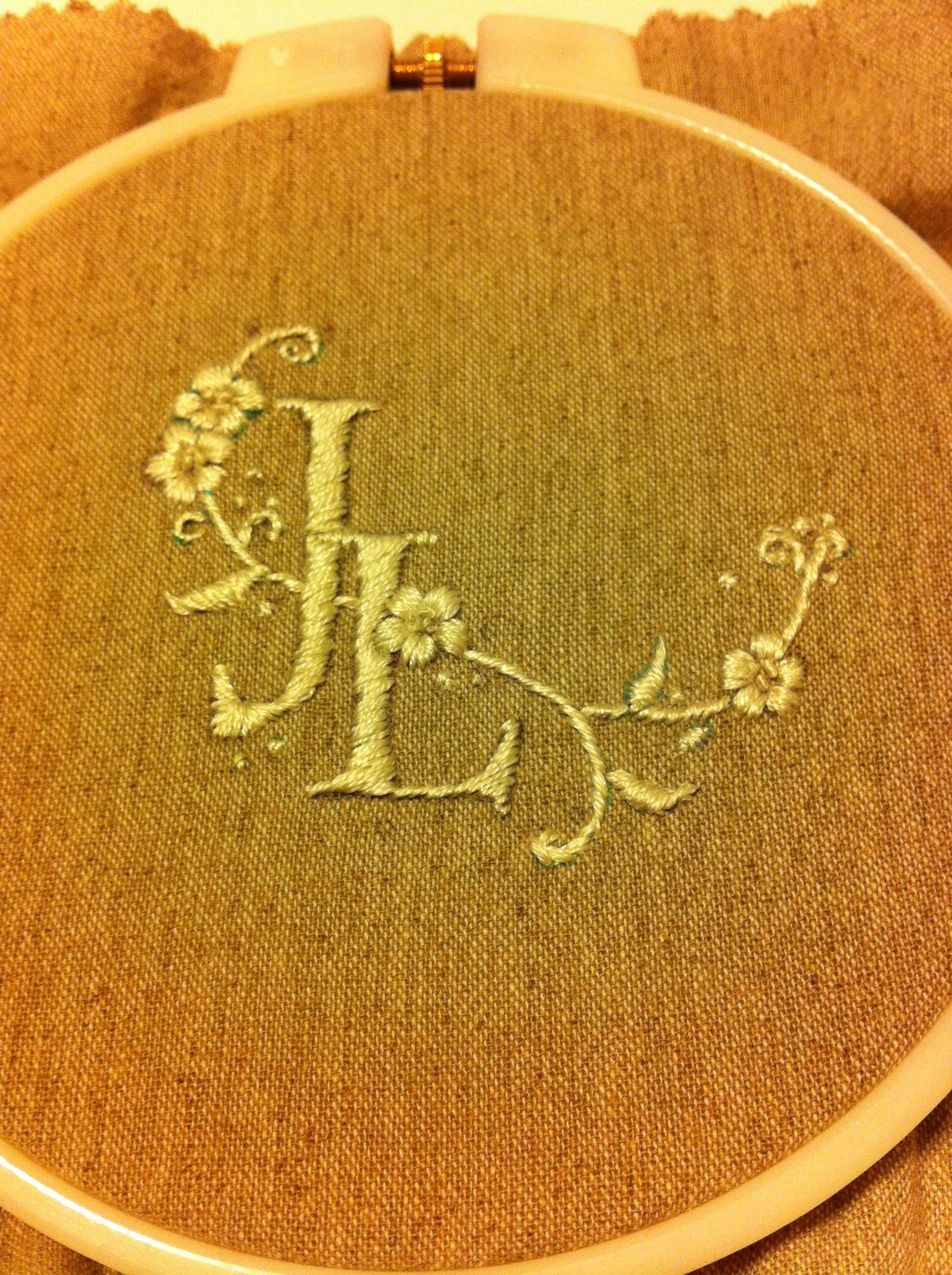 First of all, draw your design on a piece of paper. You can also pencil out the direction where the threads will go. Then, trace your design on the embroidery cloth using washable pen. Mount it tightly on the frame. For my design, I begin by doing the flowers first, then branches, initial last.