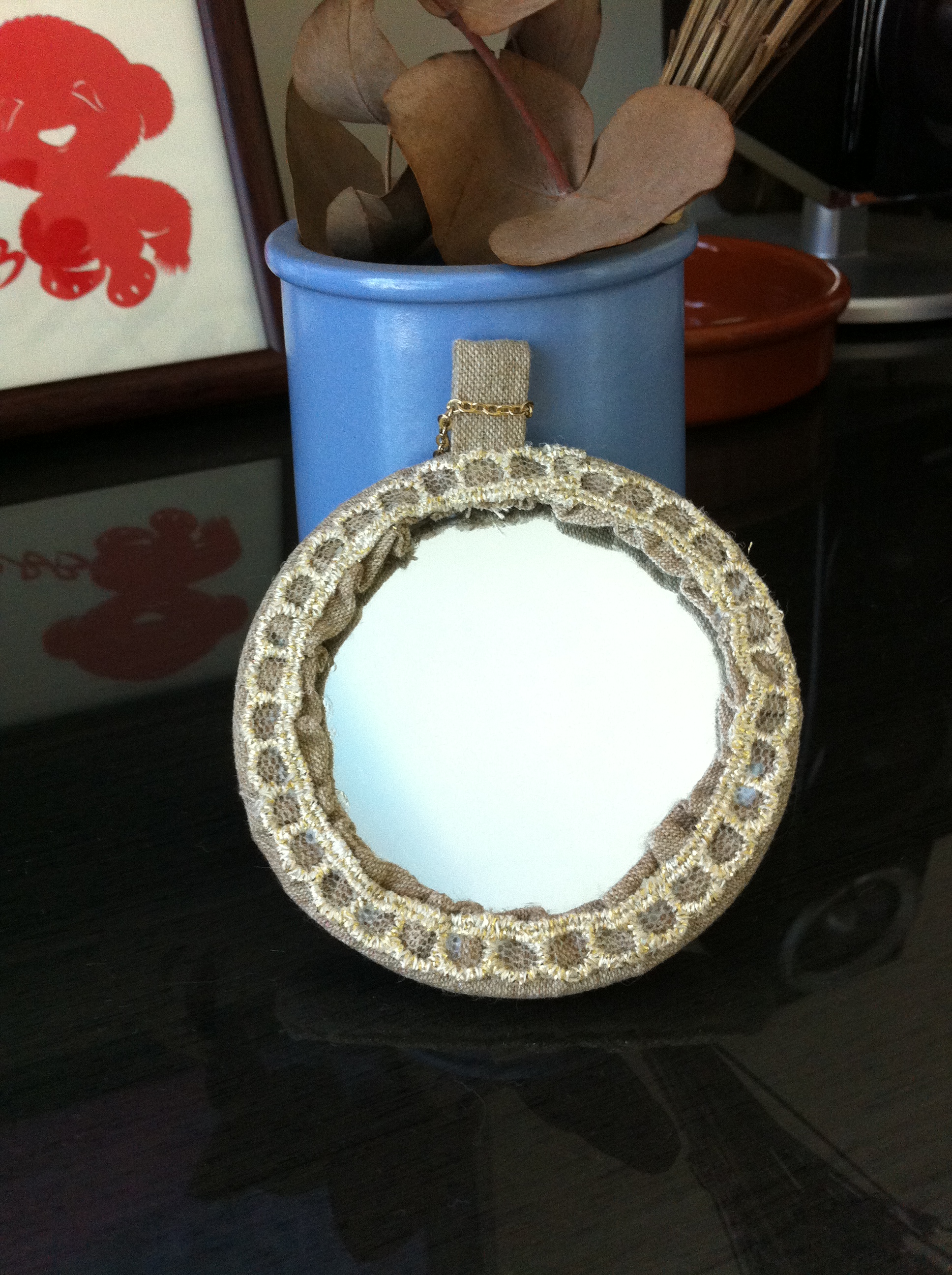 Once the embroidery is done, lay down your mirror on top of the embroidery piece, trace a circle 5cm bigger than the mirror, cut out any access fabric.