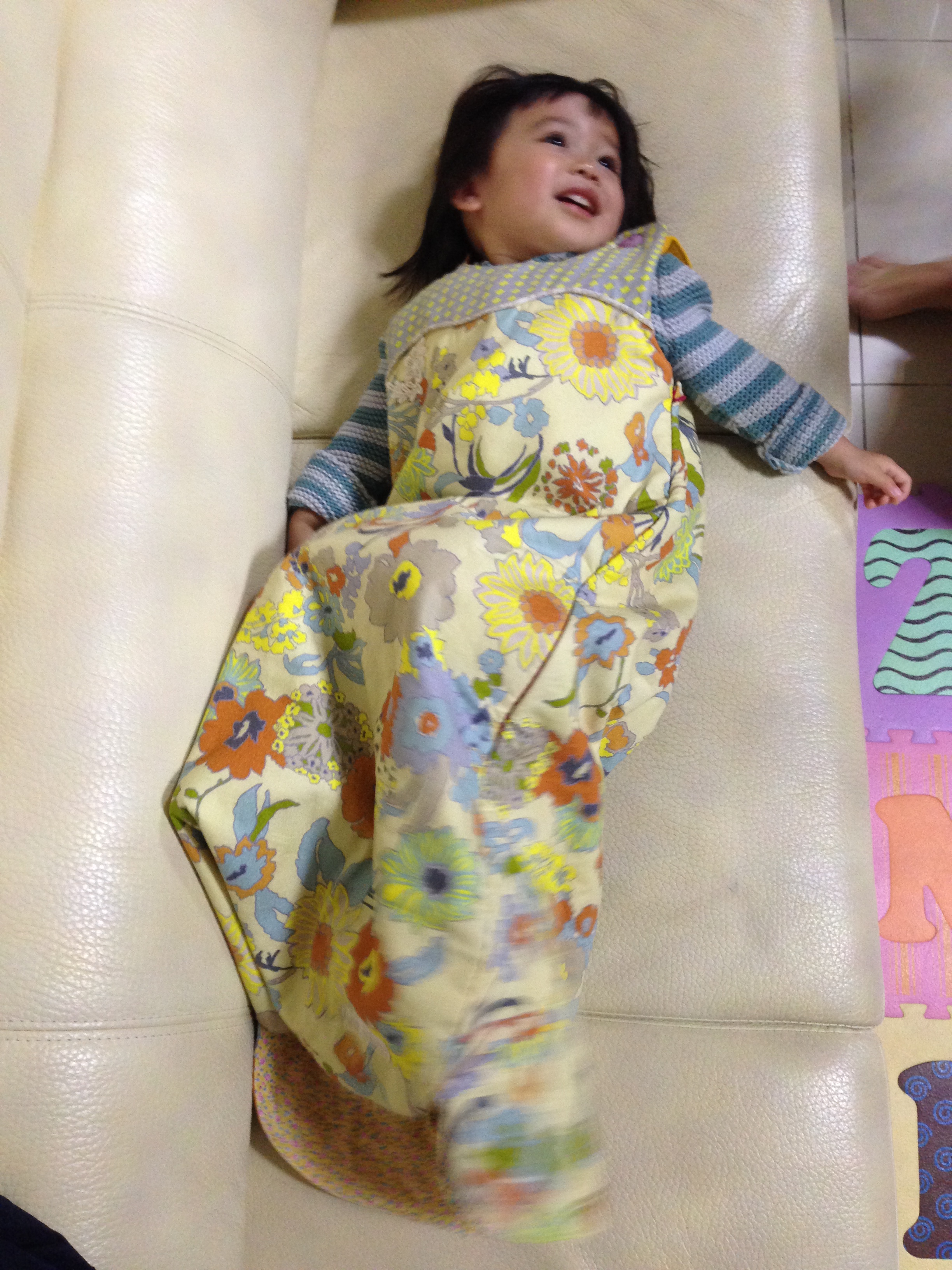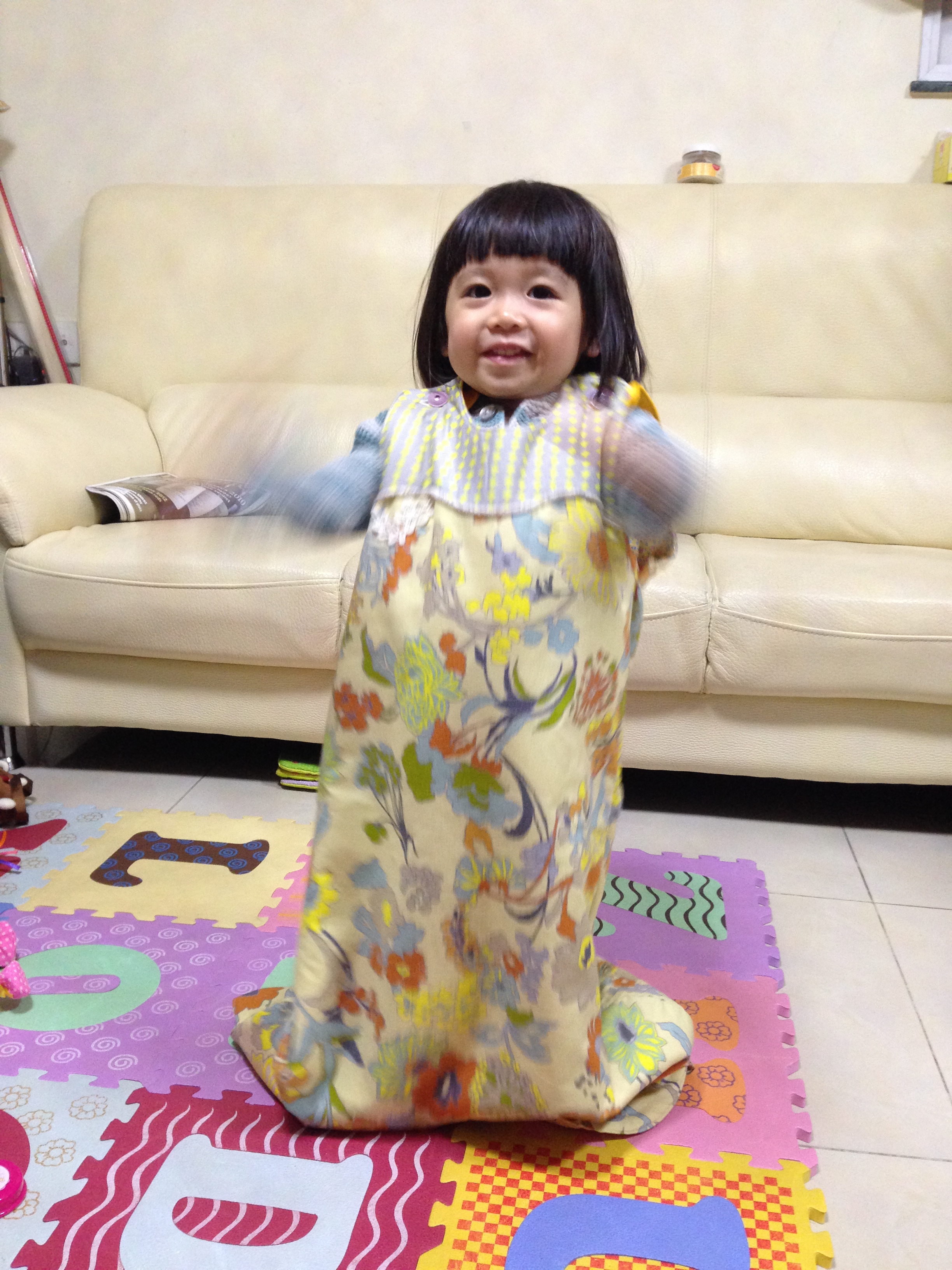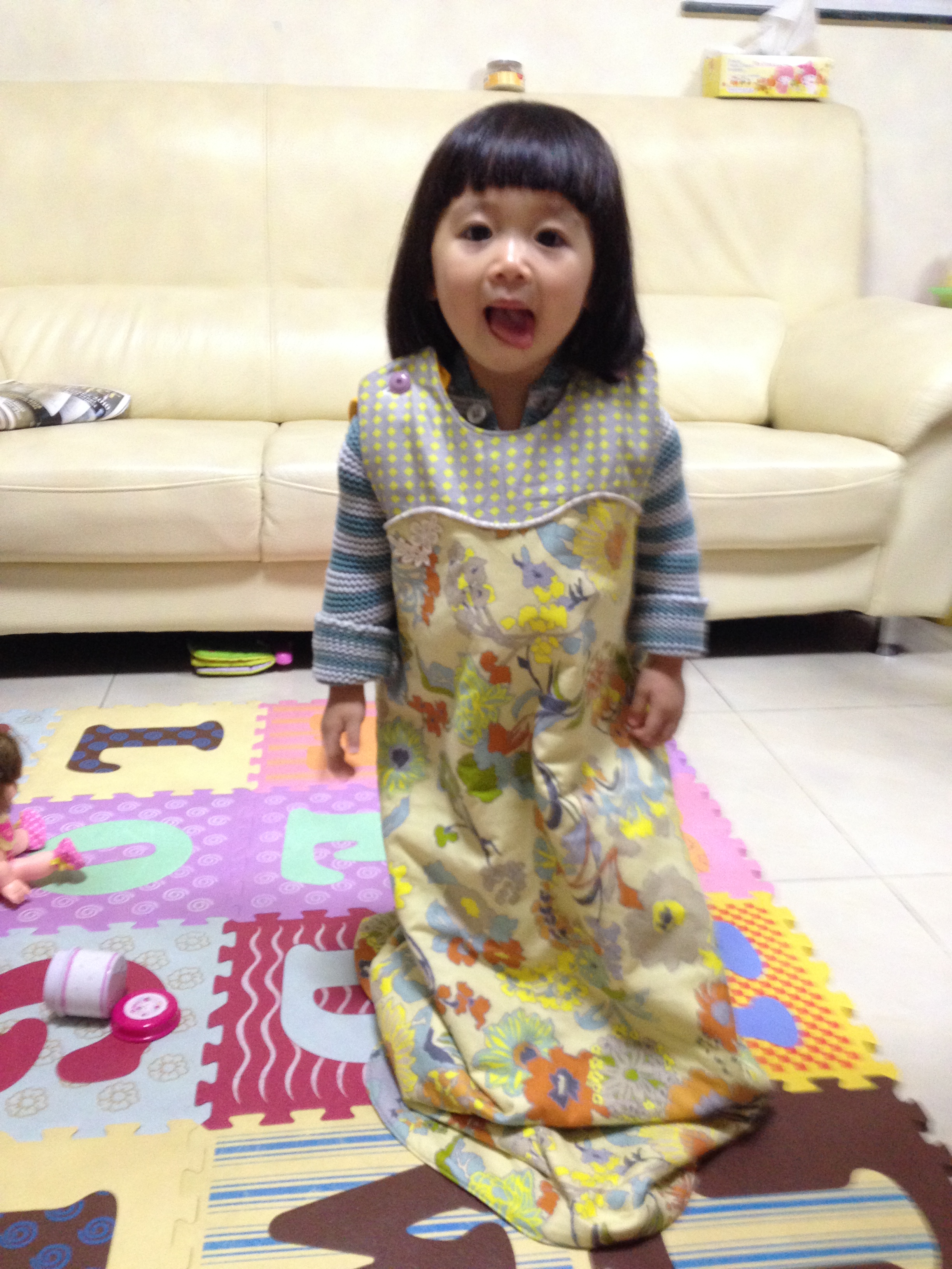 So smart to have an open-on-the-bottom version! My son still wears a sleeping bag and he is almost 3, but he awkwardly hops around in it. I’m afraid he’ll fall in it.