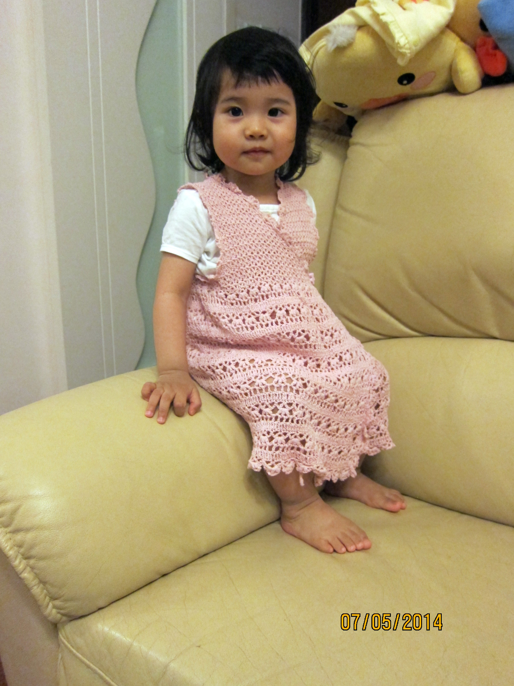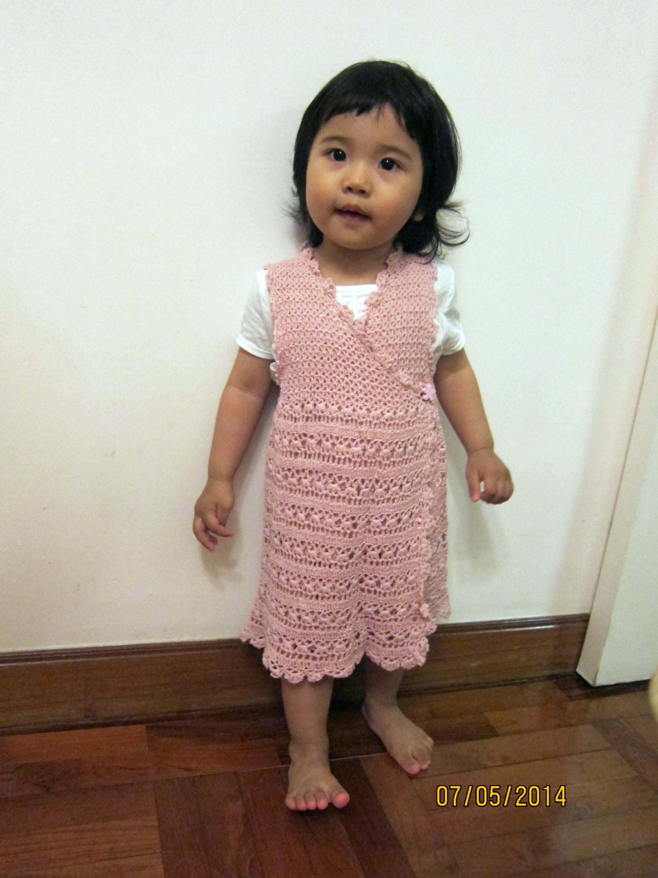 多謝客人提拱的相片.好開心見到漂亮的小Sammy. 第一次為人父母的客人, 看到日本書上一頁頁漂亮的鉤織衣物, 就忍不住為女兒訂做一件. 夏天來了, 就選用日本Sea Queen線為小Sammy打造她的第一件手制背心裙.