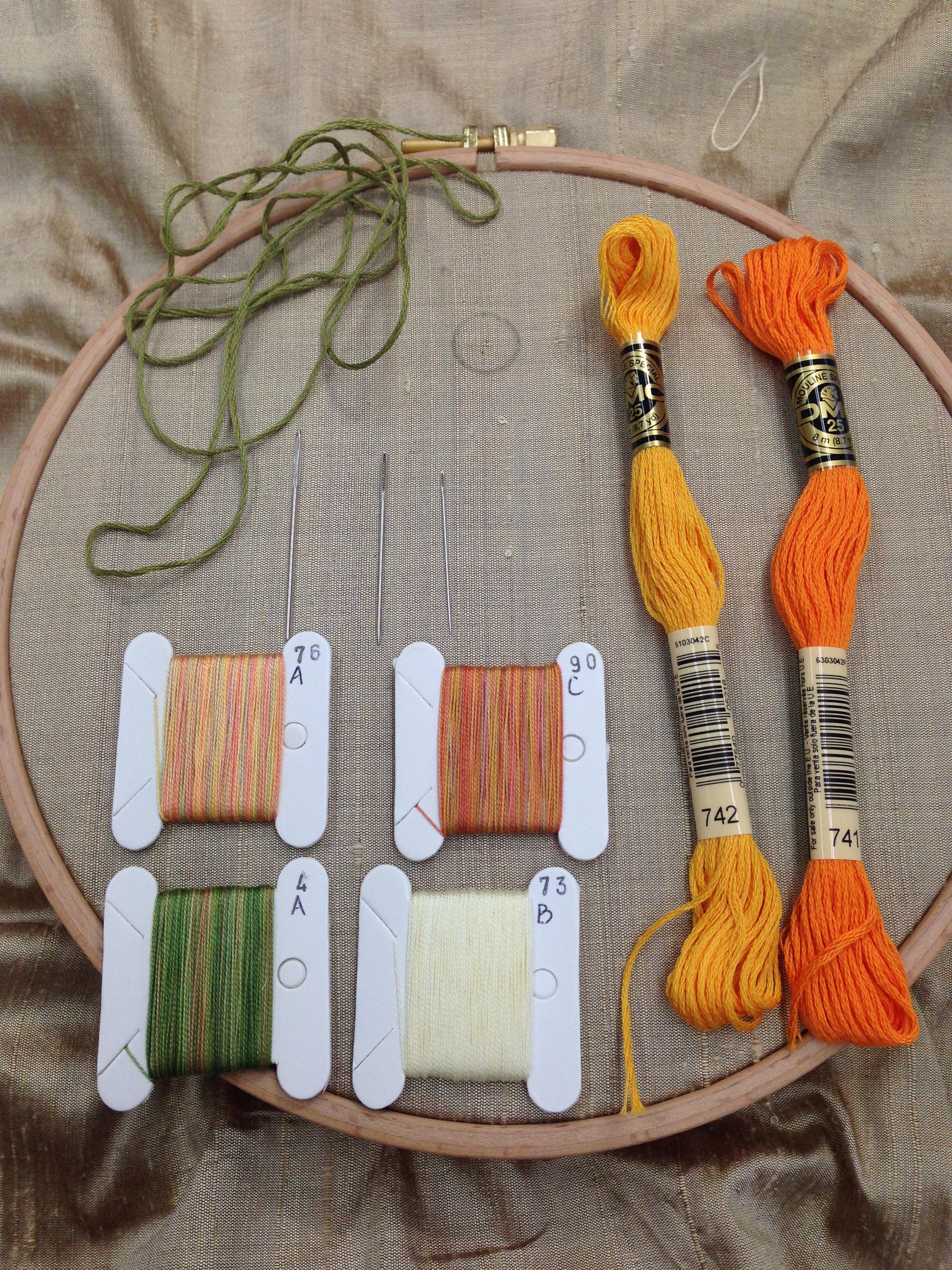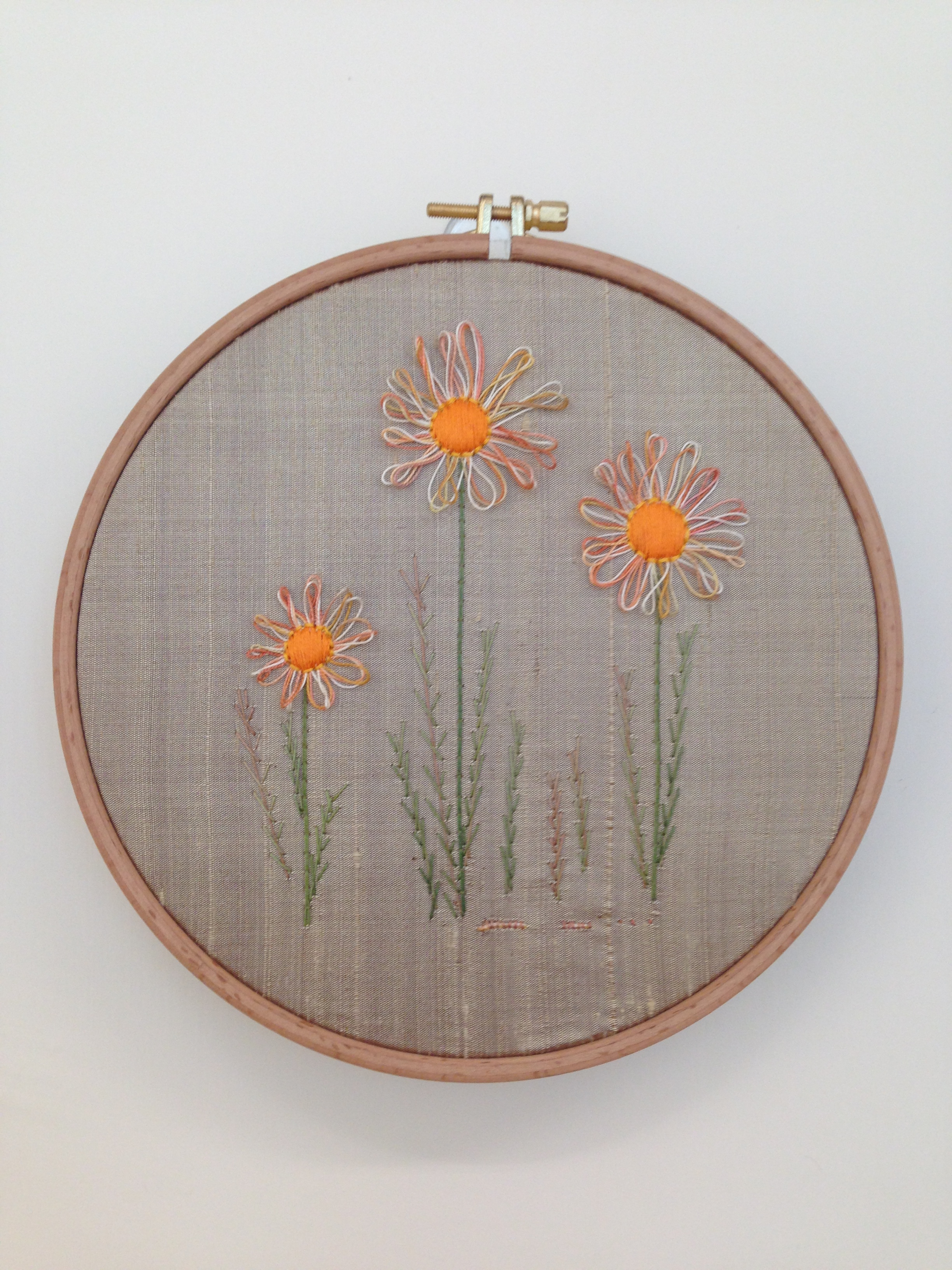 有一段時間没有做過刺繡了. 今次, 我跟一位資深的老師學這個 “野菊花刺繡刺繡”, 其中有幾個刺繡針部是她自創的, 包括由Pekineses 針部演變而成的花花圈和葉既針部. 布就用上了印度的絲綢綿布. 金金地的布料加獨有的布紋, 令本身簡單的花樣變得不平凡.
