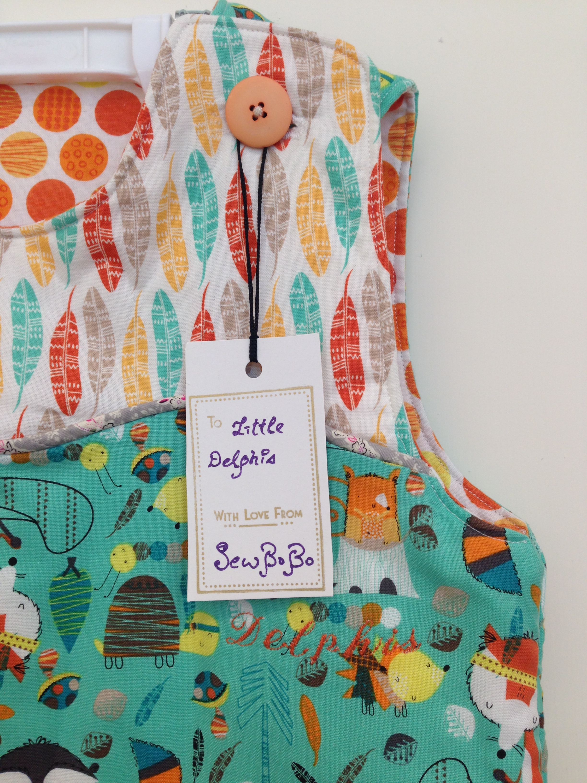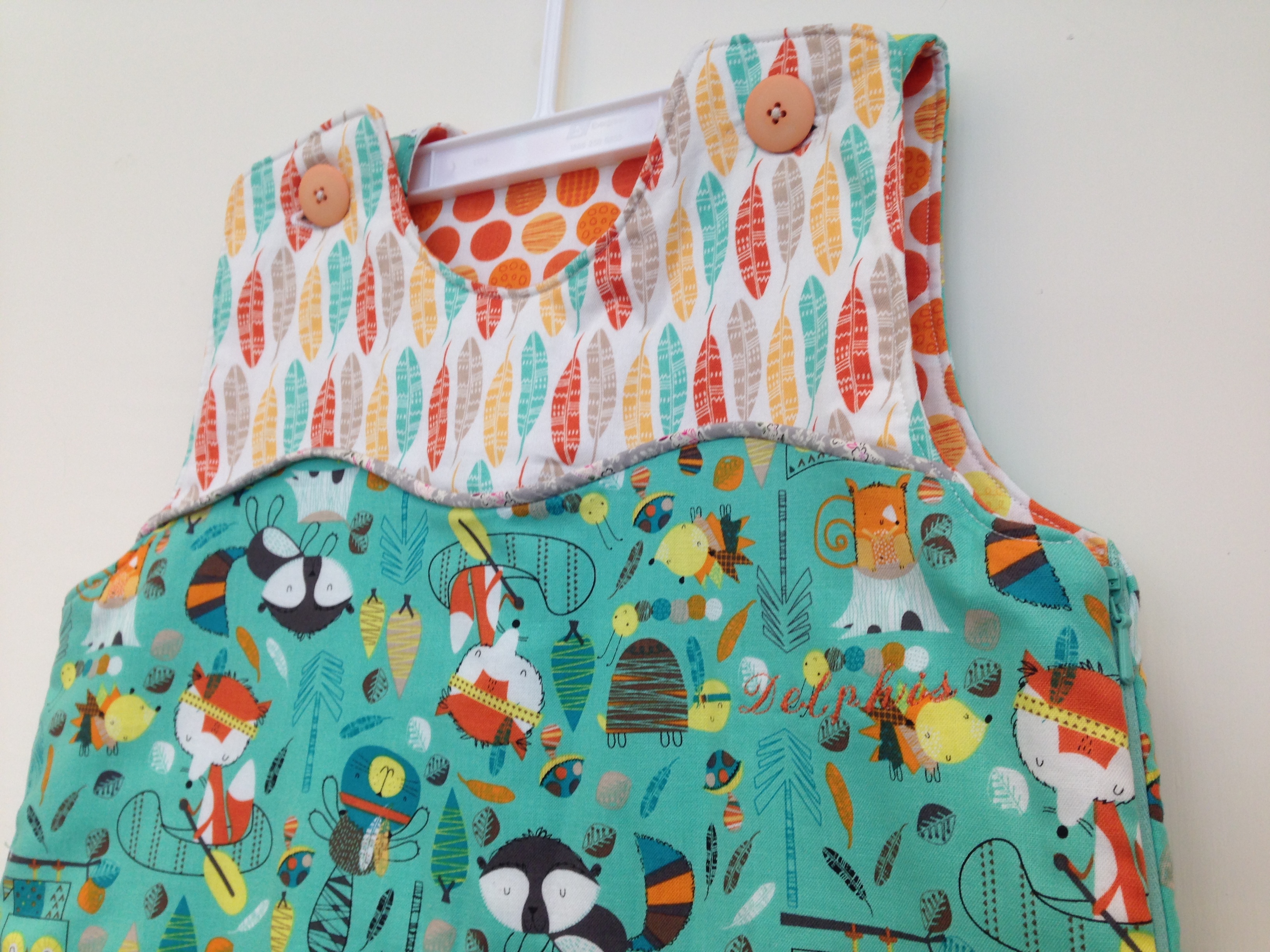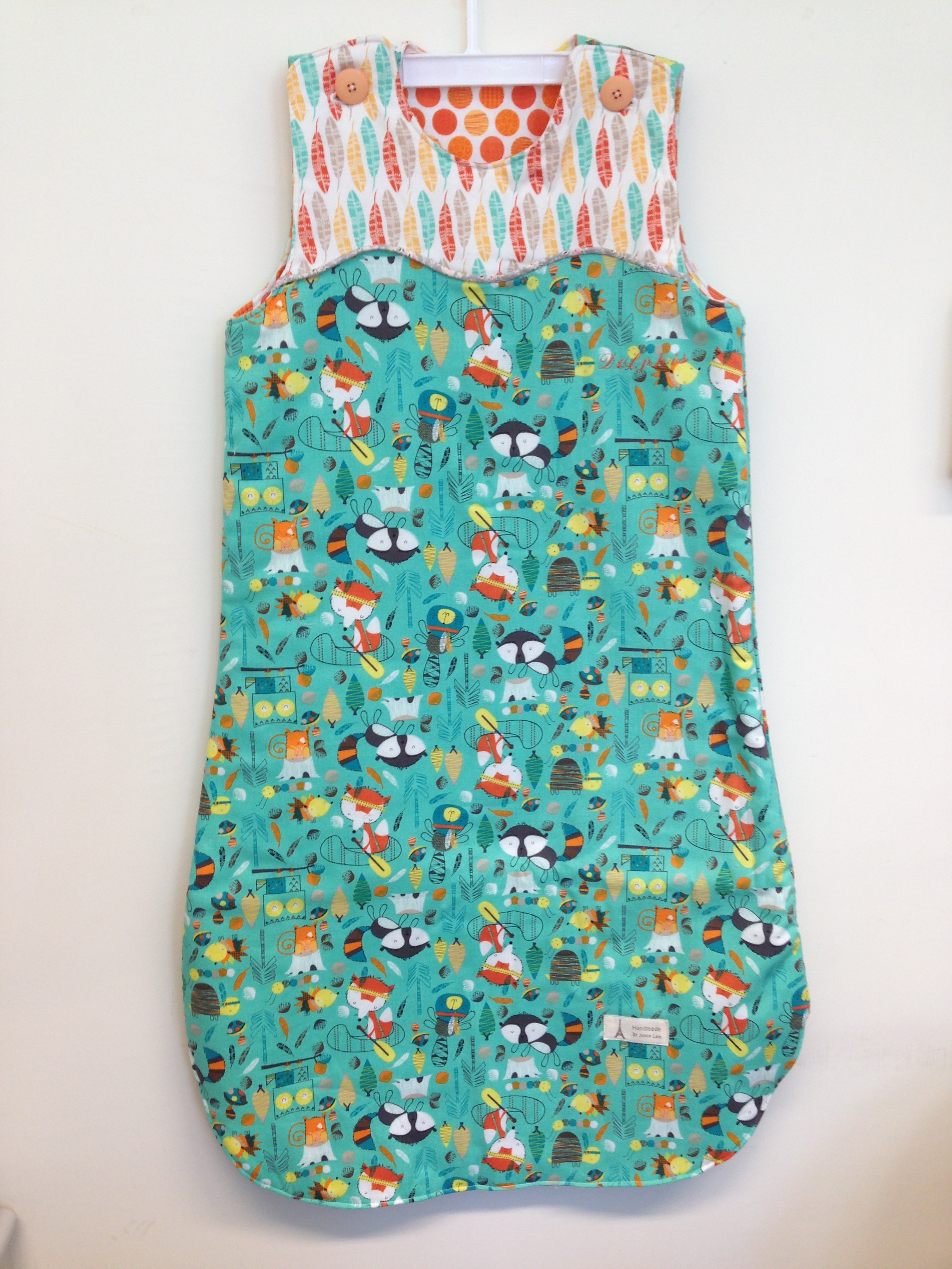 This sleeping sack is for Little baby Delphis. We specially order the fabric from US little fox fabric collection. It very different from Japanese fabric, US fabric design tends to rich in color, very suitable for making kids clothing. I love US Fabric.